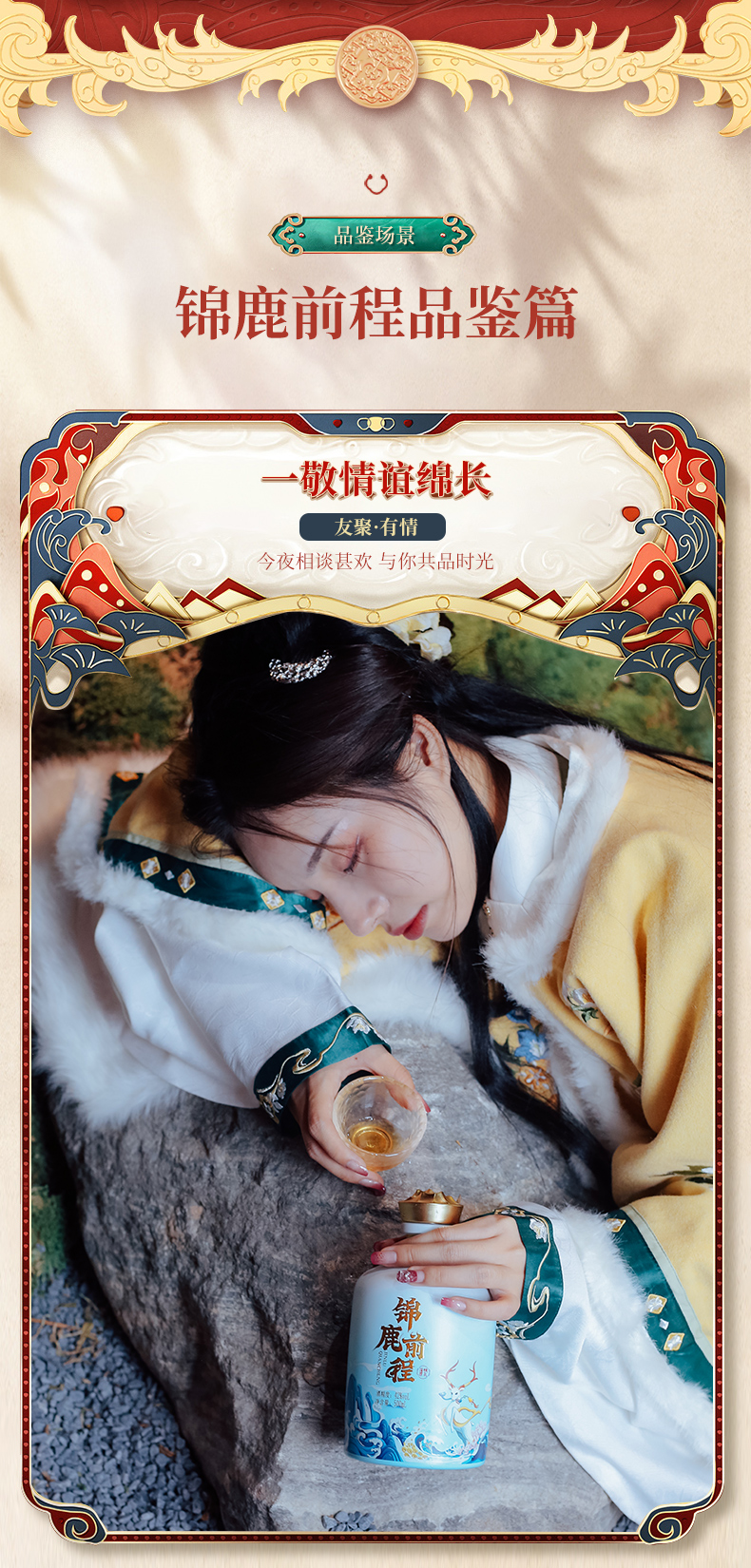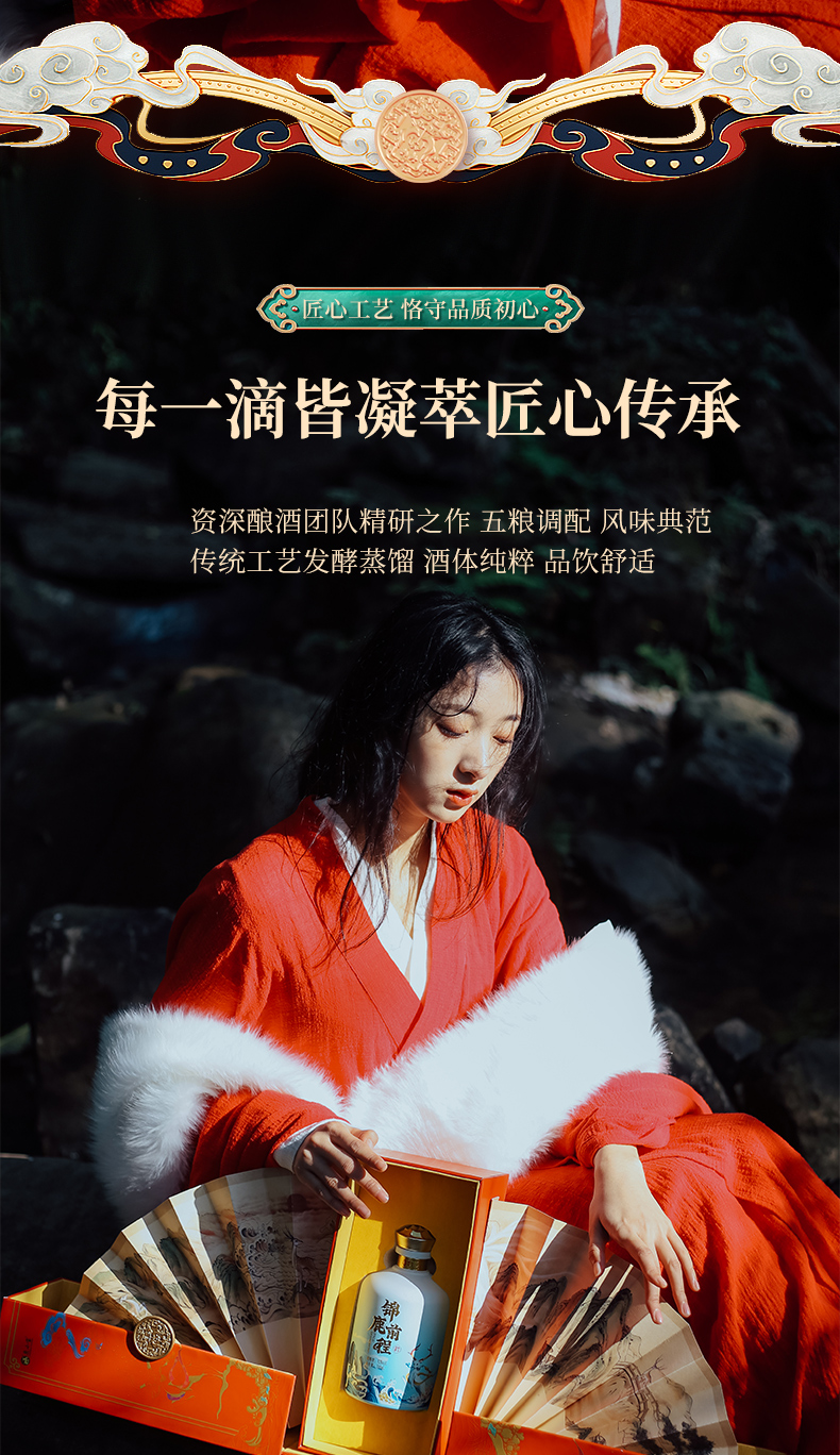 此产品为锦鹿前程系列,独特扇形装饰品饮更有仪式感,寓意大展鸿图、圆满吉祥.锦鹿前程豪礼传奇,瓶身精致山水插画彰显前途不可限量.礼盒烫金圆扣,赠礼高档尊贵.红色喜庆装饰适合欢聚时令,您值得拥有.