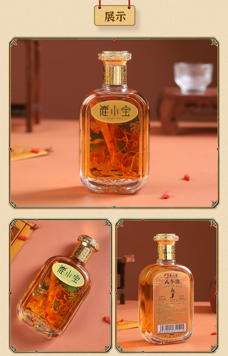 此产品由125ml人参酒x6瓶,另选用精美特色瓶身,新型背透瓶标设计,包装选用国风插画风格,每瓶带有一颗人参,显得更加精美大气.