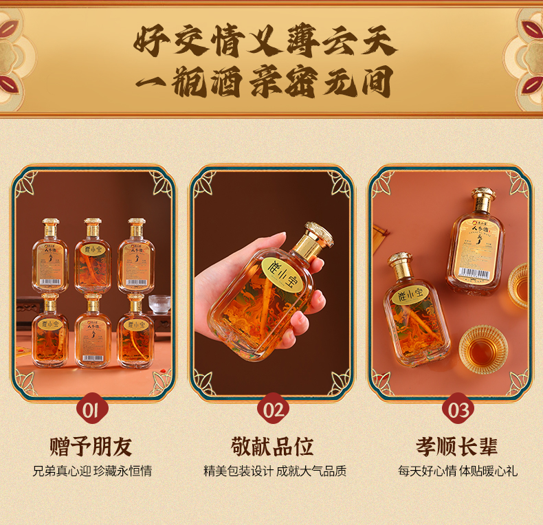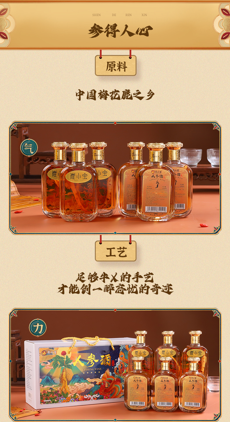 鹿小宝品牌----此产品小酒系列人参酒,精白瓶身,每瓶都有一颗人参,新型背透设计,自饮送礼之上选.