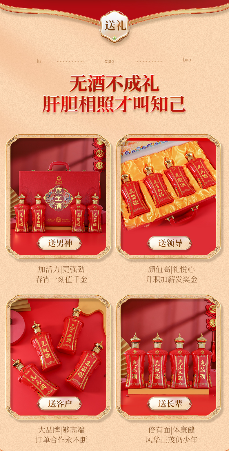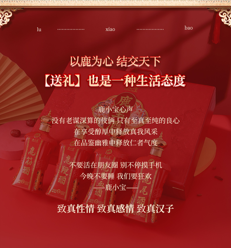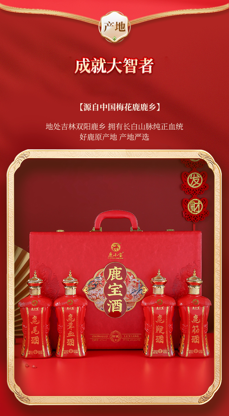 鹿小宝品牌----此产品内置鹿鞭酒,鹿尾酒,鹿茸血酒,鹿筋酒各一瓶,构成鹿宝酒,送礼更大气,自饮送礼之上选.