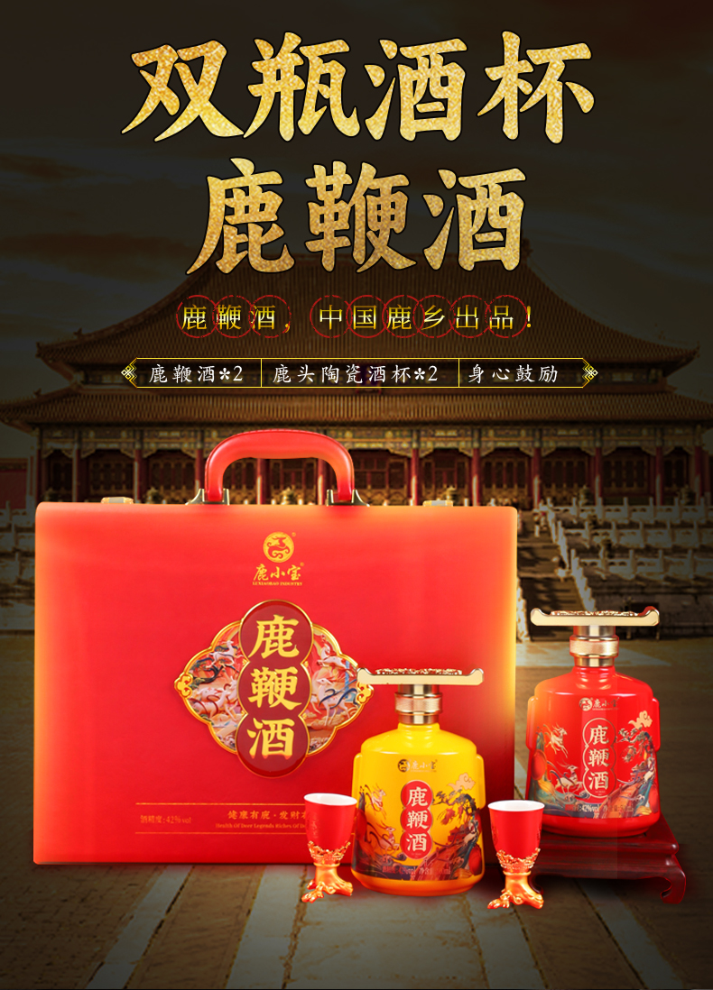 鹿小宝品牌----此产品为双瓶鹿鞭酒,一对陶瓷鹿头酒杯,彰显王者风范,送礼更大气,自饮送礼之上选.